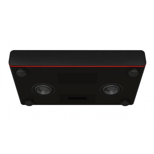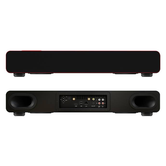 Устройство выполнено в форм-факторе саундбара. На передней панели - среднечастотные и высокочастотные динамики под съемным матерчатым грилем, а на дне корпуса расположился встроенный сабвуфер.