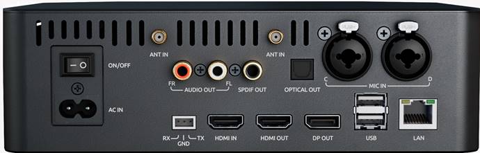 Эта модель самая крупная в линейке. Изготовлена она тоже в корпусе из фрезерованного авиационного алюминия, который шире обычных EVOBOX. И это не просто так: на задней панели устройства целых 4 независимых микрофонных входа. Штатные беспроводные микрофоны в системе не предусмотрены. В соответствии с классом системы, подразумевается, что у ней будут подключаться микрофоны профессионального уровня, вроде SHURE BLX1288E/SM58 или Sennheiser XSW 2-835-A