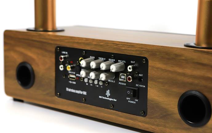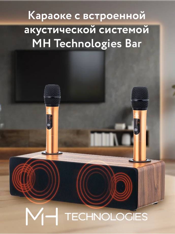 Начнем с караоке-колонки MH Technologies Bar с двумя беспроводными микрофонами. Колонка имеет форм фактор небольшого саундбара. В верхней ее части предусмотрено два “стакана” для установки беспроводных микрофонов, питающихся от двух пальчиковых батареек размера AA. Корпус саундбара выполнен из МДФ, ну а микрофоны имеют металлический корпус.