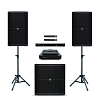 В состав комплекта входит пара активных акустических систем MACKIE THUMP212 с пиковой мощностью 1400 Вт каждая. Главная особенность серии THUMP, помимо чрезвычайно прочного корпуса, высокой мощности и качественного звучания во всём диапазоне частот, — встроенный подавитель обратной связи. Он особенно полезен при работе с микрофонами в непосредственной близости от колонок: функция позволяет практически полностью устранить эффект «заводки» микрофонов с резкими неприятными звуками, которые могут повредить акустику.